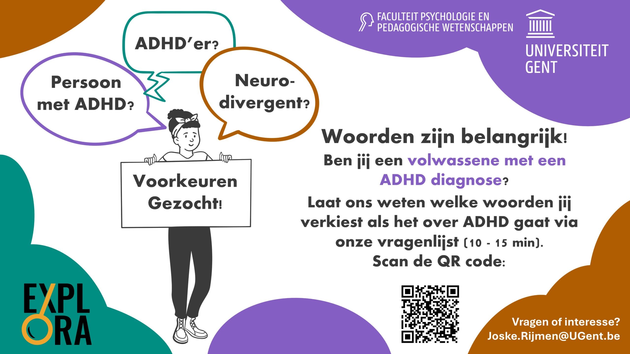- Onderzoek naar taalgebruik rond ADHD, EXPLORA – UGent, lopend onderzoek – flyer
